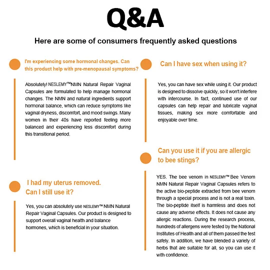 Extensive research shows that these ingredients work synergistically to balance hormones, reduce inflammation, enhance metabolism, and maintain overall health. NESLEMY Bee Venom NMN Natural Repair Vaginal Capsules combine them in a scientifically formulated blend, providing a comprehensive approach to women's health. Each ingredient is backed by scientific evidence, ensuring the product's efficacy and safety, which users can trust.